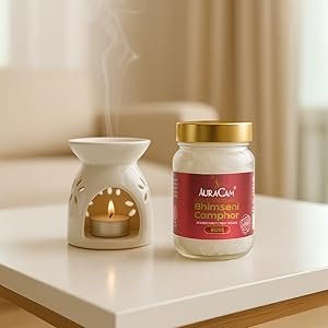 Place a small piece of AuraCam’s fragrant Bhimseni camphor onto your diffuser and let its soft burn fill the space with clarity and comfort. As the natural vapors release into the air, they not only purify your environment but also calm the mind and invite stillness into your space. It’s a simple yet powerful ritual that turns any corner of your home into a moment of intentional living.