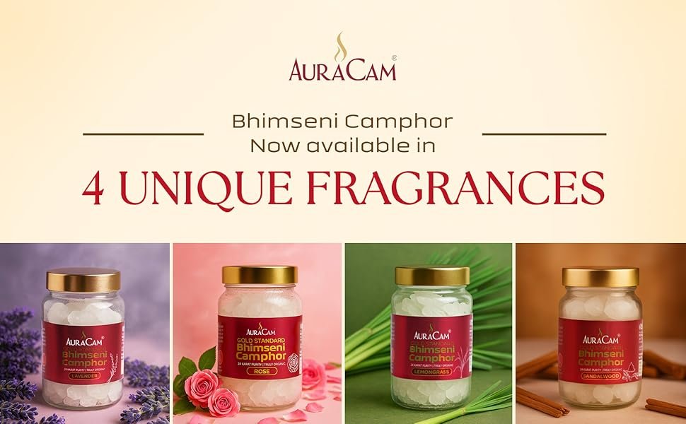 Experience a New Dimension of Calm with AuraCam Bhimseni Camphor. Harnessing the purity of traditional Bhimseni camphor and infusing it with nature’s most timeless scents, AuraCam introduces four uniquely crafted variants — Sandalwood, Lavender, Oudh, and Citrus. Each fragrance is thoughtfully blended to help you ground your energy, elevate your mood, and enrich your personal space with an aura of wellness. Whether you seek peace, clarity, or presence, let AuraCam accompany you with fragrance that feels as pure as it smells.