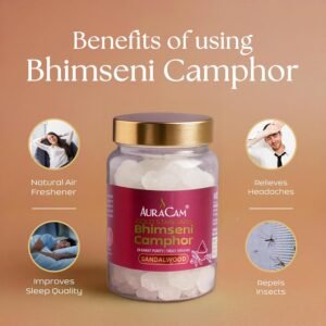 AuraCam Bhimseni camphor comes in its purest form and offers numerous medicinal benefits. It is known to have antibacterial and anti-inflammatory properties. This makes Bhimseni Kapoor an essential ingredient in your home. Bhimseni camphor is a perfect remedy for mental and physical health. Bhimseni camphor can also be used for puja needs. This means you can skip the chemical-laden camphor and opt for pure camphor like AuraCam Bhimseni Camphor. Buy Bhimseni Camphor online from AuraCam as we offer pure Bhimseni kapoor.