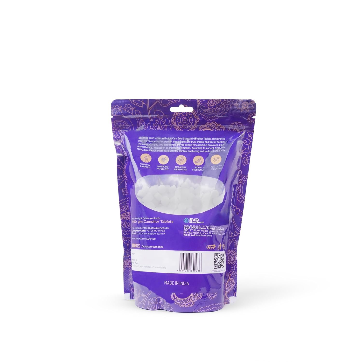 AuraCam Gold Standard Pure Camphor Tablets Pouch for Puja, Meditation, Spirituality | Aromatic Kapooram Tablets | 100% Pure Kapur Tablets Pouch (Small, Pack of 1, 500 g)