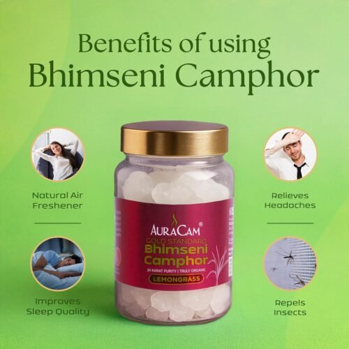 AuraCam Gold Standard Bhimseni Camphor – 100 gms/Camphor for Pooja/100% Pure Brass Kapoor/Aromatic for Pooja, Meditation, Havan, Room Freshener/Pure & Natural Pacha Kapoor (Lemongrass Flavour, 100 gm)