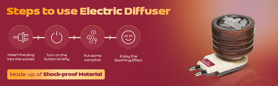 | Diffuse the Fragrance | Keep the Kapoor / Essential Oil or any other fragrant product you want to diffuse on the top of the camphor diffuser electric and switch the burner on and it will start diffusing the fragrance all over and freshen up the environment removing bad odour out of your space. |